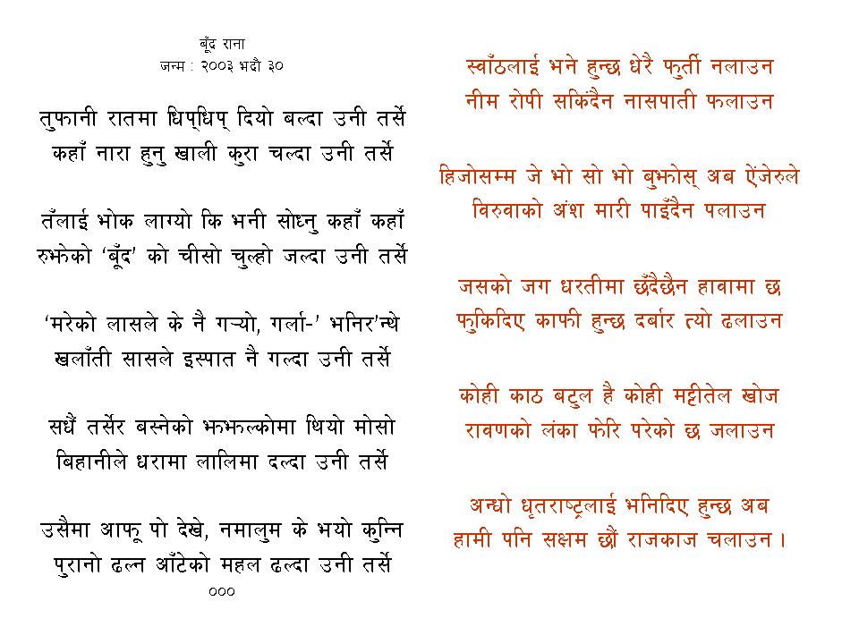 गजल (dont know who the writer is ) सुन साथी भाषणको विरुद्धमा छु एकलौटी शासनको विरुद्धमा छु मान्छेलाई लुटिएको कथा बेग्लै छ जन्मँदैमा आसनको विरुद्धमा छु पूर्व मेची रुँदाखेरि पश्चिम हाँस्दैन जनतालाई कासनको विरुद्धमा छु पहाडमा भोकमरी मधेश के होला महँगो यो रासनको विरुद्धमा छु from Nepalikavita.com