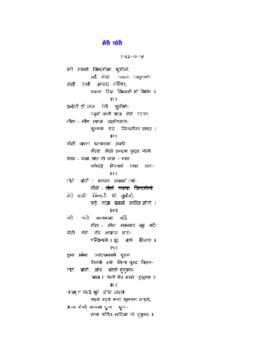 यो फुटो बनाएर टाँस्दा घरि ठूलो साइजको घरी पढ्न नमिल्ने हुँदो रै छ अत: कपी पेस्ट अरेको छु तल: मेरी छोरी २०६३-०२-०४ मेरो स्यानो जिन्दगीमा खुशीको, छर्दै मीठो वासना पालुवाको- सानी – सानी अप्सरा वर्लिएर, सज्जा दिंदा जिन्दगी भो बिभोर ॥ ॥१॥ इन्द्रेणी झैं सप्त – रंगी खुसीको- चढ्यो लाली आज मेरो धरामा, नौला – नौला स्वप्न उद्घोषसाथ- झुल्क्यो मेरो जिन्दगीमा प्रभात । ॥२॥ मोती जस्ता दन्तमाला उघारी- हाँस्छे मीठो छन्दमा फुट्छ लोली केस्रा – केस्रा ओठ ती लाल – लाल- फर्फर्राई निस्कने प्यार साथ- ॥३॥ तोते – बोली ! साथमा सासको त्यो- मीठो – मीठो वासना जिन्दगीको, मेरो बासी जिन्दगी भो सुनौलो, पाई ताजा प्रेमको कान्ति नौलो ॥ ॥४॥ रंगी – चंगी कल्पनामा बहँदै मीठा – मीठा स्वप्नका नूर छर्दै- पोती मेरो नीर आकास सारा- चन्द्रिकाले । दूर नाचे सितारा ॥ ॥५॥ ठूला आँखा ज्योत्सनाको मुहान वैसाली त्यो नित्य चुम्दा बिहान- तोते बोली, ओठ खोली मुसुक्क- ‘बाबा !’ भन्दै छेउ बस्छे टुसुक्क ॥ ॥६॥ ‘मामू !’ भन्दै खुर्र दौडेर जान्छे लड्छे उठ्छे मन्द मुस्कान छाड्छे, आमा बोक्दै काखमा चुप्प – चुप्प- माया गर्छिन् छातिमा ली लुपुक्क ॥ ॥७॥ देखाउँदै रीस गाला फुलाई घुर्काउँदा बाल – हठ् त्यो जताई- लोला साना नाकका ती अमोल- शोभा बन्छन्, रूप झन्-झन् कमाल ॥ ॥८॥ प्यारो उस्को आकु लाई सिंगारी साना – साना हातले त्यो मुसारी, ‘हाऽ ! हाऽ !’ भन्दा काखमा ली फुरुक्क- नाच्छन् थुँगा ओठमा ती सुटुक्क ॥ ॥९॥ हेर्दा उस्को बाल लीला अपार जाज्वल्य त्यो सौम्यगन्धी मुहार, हृत्तन्त्रीका तार झंकृत हुन्छन् ब्यथा सारा दूर भै दूर जान्छन् ॥ ॥१०॥ १) आकु- जापानी शब्द आकाच्यान(स्यानो मानव शिशु) बाट ‘स्यानो पुतली (गुडिया)’ लाई स्नेहपूर्वक कविकी छोरीले राखेको उपनाम। अस्तु, धन्यवाद!