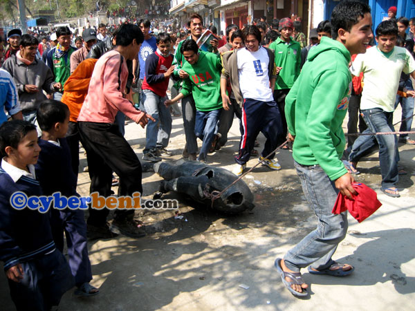 They are treating Late King Birendra worst than Saddam Hussein. I am not sure if they know who he was, it looks like most of them are younger kids with no brain. I feel like I have to create my own Party here. Stupid Leaders make their people more stupid. Its such a disgrace. Never B Peace in Nepal looks like. What a phucken sad day to see this.