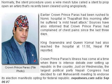 I am not a fan of Paras or the Monarchy but it's a pity to see a person in his thirties get a heart attack. I only hope he listens to Dr Panday's advise and changes his lifestyle. Maybe this will be a life-changing experience for him. Or maybe not given past experience. This might also be a good moment for him to pause and reflect on his life and decide what he wants to do next. But, like Thapap says, what do I know :O (and Paras is prolly not going to be checking Sajha from his hospital bed anyways to listen to my advise ) :)