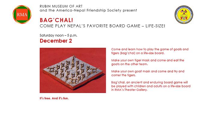ल है, हाम्लेहुर! हाँरो चौतारीआँ नि कोई छन् कि बाघ चाल खेल्न सिपालु? "This is an important event for all of us because we not only get to have fun with the unique Nepali board game, but also educate museum visitors about it and the traditions of Nepal." -- from one of the promoters of the event. The participants will also receive complimentary passes to beautiful art galleries in RMA. RMA is dedicated to the art from the Himalayas and the surrounding regions: -http://www.rmanyc.org