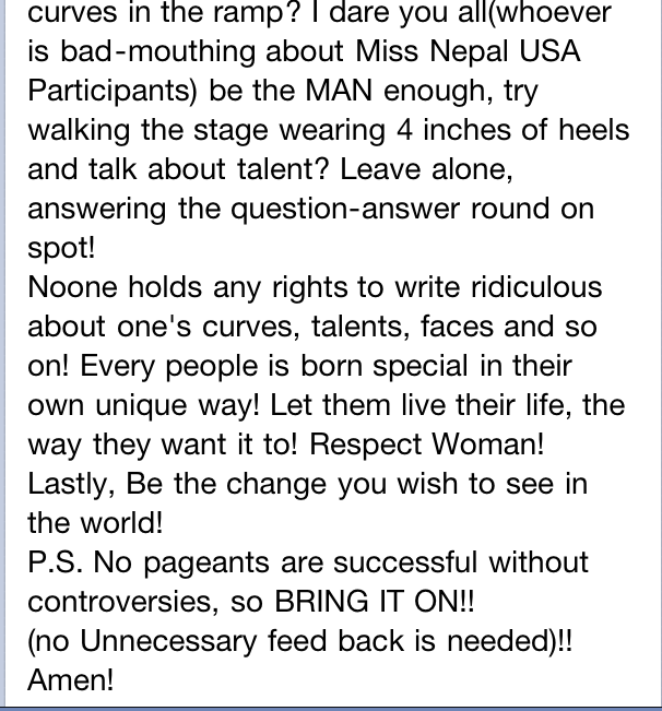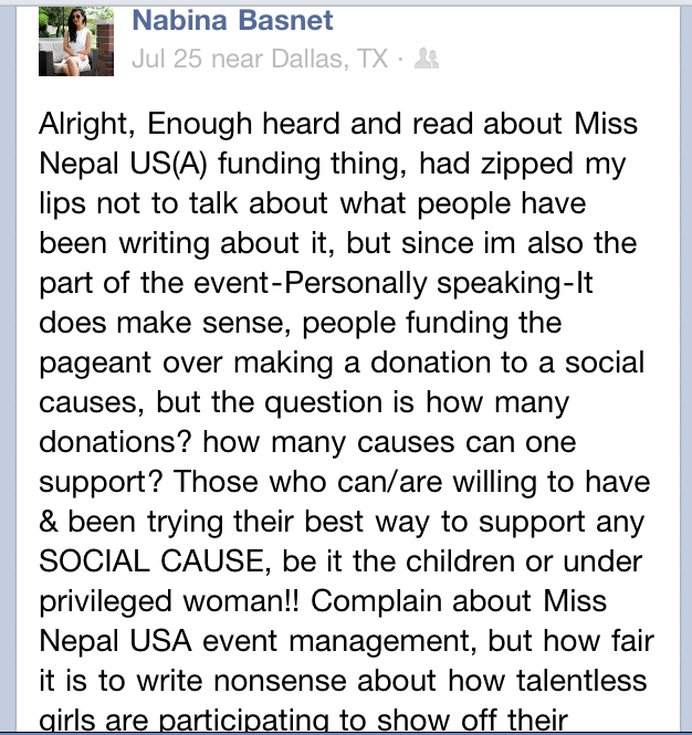 LOOK AT THIS BY NABINA BASNET. yo chorni le Miss Nepal US organizers lai defend gareko.