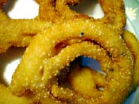 Heat oil. Pour some of the batter into a baking pipe. Pipe out the mixture into oil so that you have created an enclosed circle. Allow frying until the oil side of Selroti is golden brown; turn over on the other side. Remove from oil once both sides are cooked to golden brown and crispy. Place on a sheet of paper towel to absorb excess oil. Continue frying until all the batter is finished. To serve, place two Selrotis on a plate; dust them with powdered sugar