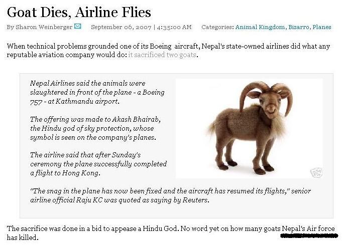 Hahahah This news is friggin everywhere. Even my co-workers are having a laugh about it. My defense, I'm a Buddhist and we have no animal sacrifices (Thank God). Wonder how my Hindu brethern are doing today...Be prepared to hear someone ask you about the goat sacrifice for a "smoother flying". hahahah This is a fuggin riot!! From somewhere in the internet's domain (last para sums it all up). Goats sacrificed for smooth flying KATHMANDU, Nepal, Sept. 5 (UPI) -- Officials at Nepal Airlines Corp., plagued by recurring technical problems, say they sacrificed two goats to appease the gods. The sacrifice was made in front of an NAC aircraft at the airline's hangar at the Tribhuvan International Airport in Kathmandu, with airline executives in attendance, ekantipur.com reported. The airline's top management was consulted before the worship and goat blood were offered to the deity, an NAC official said. The idea to offer a sacrifice came to an airline engineer who said he dreamed that a deity was angry because the corporation had not appeased him by sacrificing goats, the news agency said.