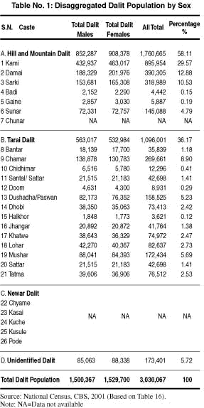 In view of the still unsettled system of classifying Dalit caste groups, estimating the Dalit population is difficult. One estimate puts the number of Dalit people at 13.09 % out of the total population of 23,151,423.[1] This means that the total Dalit population is 3,030,067, with Kami the largest group with 29.57% and Halkhar the smallest group with 0.12 %. Dalit women comprise 51% of the total Dalit population.