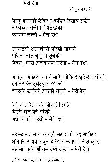 GOKUL JEE very nice poems. i liked your last poem very much. it is worth appreciable. i wish i were like you !!!! MERO DESH.... JE JASTO BHAYE PANI JASARI CHALE PANI HAJARAU PRACHANDA LE JANMA LIYE PANI ANAGINTI NEPALI AKALMAI SAHID BHAYE PANI AAKHIR DESH MERO HO MALAI MERO DESH PYARO CHHA. SOMALIYA KO HABIGAT BEHOREE PANI GIRIJA KO VASTACHARI MAHIMA TULU TULU HERE PANI DEWBA KO WAKKA LAGDO SUGA RATAI SUNE PANI DWANDA KO BHUMARIMA PILSIYE PANI AAKHIR DESH HAMRAI HO HAMILAI HAMRO DESH PYARO CHHA.......