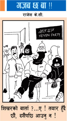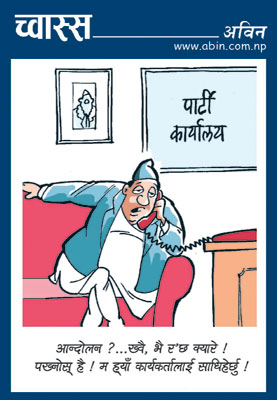 Hahaha... Yes, Rajesh is getting better and better in the recent years. He is very conscious of contemporary political events, and often manages to reflect what the common people have on their mind about these events. His use of the language that we can hear only in general Nepali conversation, not in writing, makes his cartoons even more interesting. When I saw the cartoon below right around the time Su.Ba.Tha. formed a new party called "Rastriya Janasakti Party," it cracked me up for awhile. I still find it very amusing: