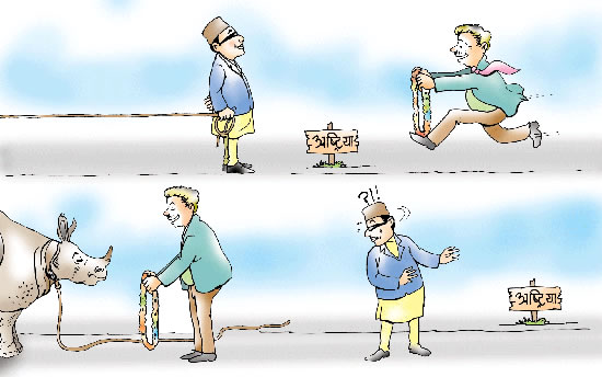 Yes, we engoy and admire other's bold steps but most of us hide in the "musa ko dulo" when we are ourselves expected to contribute. That's why nothing has happened and is going to happen anytime soon to kick out cruel monarchy. I see some action against or or mental torture to Himal Khabar soon becasue of this cartoon. Rajesh KC's cartoons sometimes directly pinch to monarchy though not as risky as this one. Do you remember one cartoon in which Giraja was taking out a dead cow labeled as "monarchy" from a carbage container?