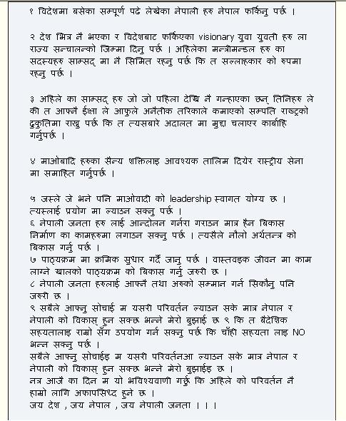aba nepal ma loaktantra ni aayo..raaja ni jaala jasto cha.. Thik bho. Raaja ko adhikaaar ni kagat ma khosiyo aileysamma lai. Thikkai cha. So far so good. Aba raaja ni bhanna napaniey bho. Tyo ni no complain. So far, pretty good. Aba rajaram lai bolawunda ni sarkar ram bhanera bolawunu parni bho. Austi Pradip Gyawali lay kutai bhetya thyo Pradip Nepal bhanera. Aba rajaraam haru lay chutai chai nabhetoon ..kinaki janta tinnai hoon..kura yinnai hoon. janta ma asikchhya ra chetana nabhaye samma kyai aye ni lachhardaina. La bhandi mailey ta. Auni ma jasta mula haru lay ni yasari kurlina nahuni ho bidesh ma basera . Wooops! sorry..rey kya last ma. Aba hamro gyanu lay ni ek shot dincha ki ta lasta bhanya jasto laagcha kailey kai malai. Marni belama Omrish Puri lay dhulo bata goli haanya jasto. You never know. laaaa..adhikar ni khosey..kyai garna nasakiney bho bhanera gyanendra yassai jholi tumba bokera night bus chadhera kathmandu chhodla jasto chai malai patakkai laagdaina. "Last action hero" rey kya..samjhya cha tyo bouddha ma herya video!!!!