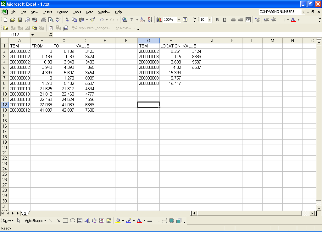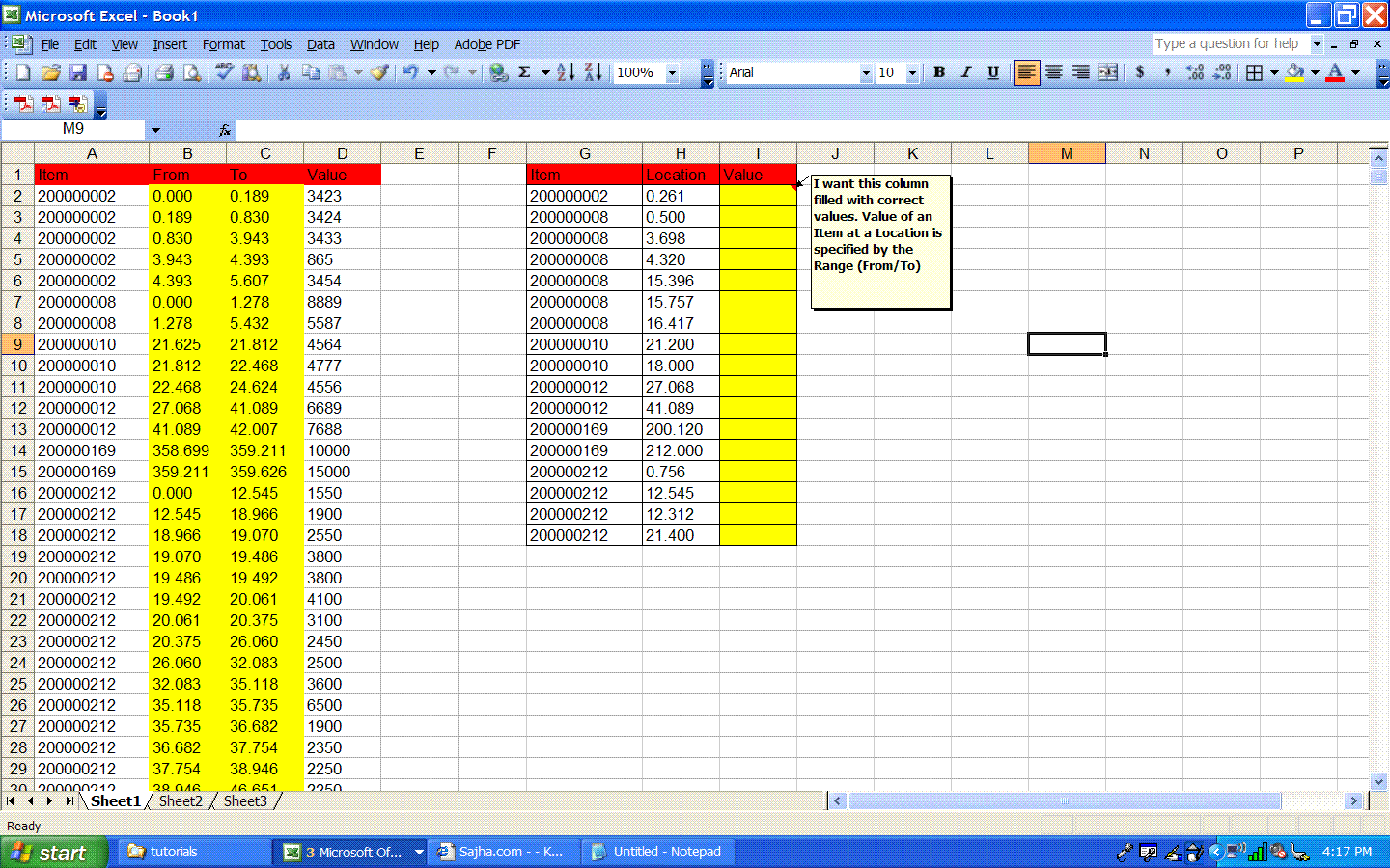 hey, bhusan: I guess, I made my question a lil complicated. actually, i want the correct value in the second table. e.g., the value in the first row in the second table should be 3424 (by observation) as location 0.261 is in the range of 0.189 to 0.830 in the first column, right? similarly, the value in the last row at location 16.417 against Item 200000008 is none as this location is beyond the range of 0 to 1.278 and 1.278 to 5.432 against Item 200000008 in the first table. i have thousands of data. so the question is how do i make excel to do it for me, ie, return me the right value at a location of an item as specified by the range. hey, bostongirl: Yes the location is not the same. these are the given locations at which i need the correct values from first table in which the values are specified by the range. clear?? hey, Slackdemic: I will try to include the screenshots! hey, TM: Yes. thats true. but thats how i got the data - thousands of entry. i guess we will have to ignore that part. GUYS!!! LEMME KNOW IF U STILL VE QUESTIONS.