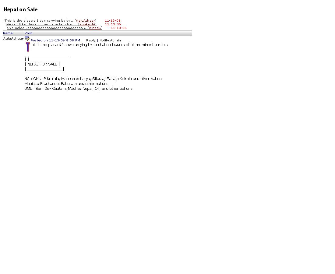Dear alu achar, YOur blog regarding" NEPAL ON SALE" is more terrible, infectitious, and catastrophic than the meager pornographic pictures in the sajha.Your son's molding mind gets blown up by your racial blogs rather than than picture of sweet naked honey in sajha. I am neither baun nor chhetri. But a nepalese. Hope you will teach your son the lesson good luck
