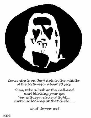 See attached file to explore illusion. Terrific Best " Illusion" This is without a Doubt one of the Best PC-Illusions, I have seen so far. Follow the instructions 1. Relax and concentrate on the 4 small dots in the middle of the picture for about 30-40 seconds 2. Then, take a look at a wall near you (any smooth, single coloured surface) 3. You will see a circle of light developing 4. Start blinking your eyes a couple of times and you will see a figure emerging 5. What do you see? Moreover, whom do you see?