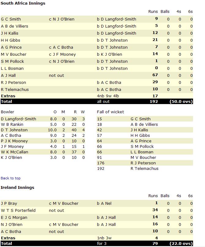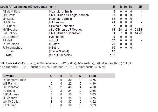SA is bowled out for 192 against ireland in the warm up and at one time they were 92 for 8.