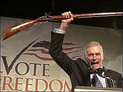 That's why I say film makers, book authors, essayists, short story writers etc should be responsible creaters about what they create. The Great Shakespeare when he wrote would set an opposition bad against good and in the end and good would emerge as victorious and thereby relay a moral. After all, he was the one who quoted "All's well that ends well" Movies like Natural Born Killers, violent video games likes Scarface, Mortal Combat should be kept away from young people's reach. People glorifying infidelity should be barred from publishing. Remember Gandhi said SEE NO EVIL HEAR NO EVIL SPEAK NO EVIL His words reverberates to this day yet people are turning a deaf ears to them. The current lawmakers seem to have definitely misinterpreted the Amendments of the constitution. Therefore, it is easier to buy real guns than fake ones. I believe, VT had a very poor Emergency Management in place if they had one even after 9/11 and Columbine High. Hopefully the Homeland Security will realize that source of terrorism can stem from anywhere not just from International students or their home countries. Hail to the NRA chief Charleston Heston, I guess. Here he is in his regular prized photo-op.