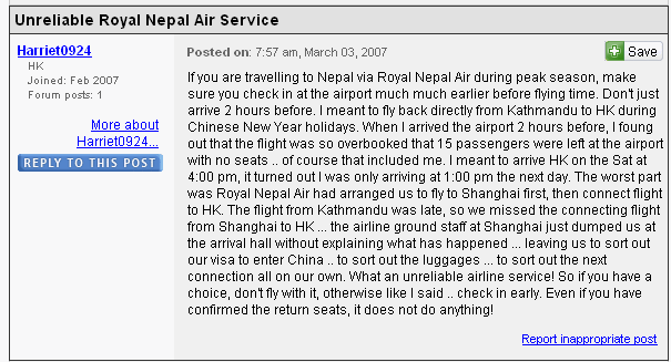 I would avoid Nepal Airlines (erstwhile RNAC) like a plague. Fly another airline, even if your ticket costs few hundred dollars more and few more hours are added in your itinerary. It is sad, but true.
