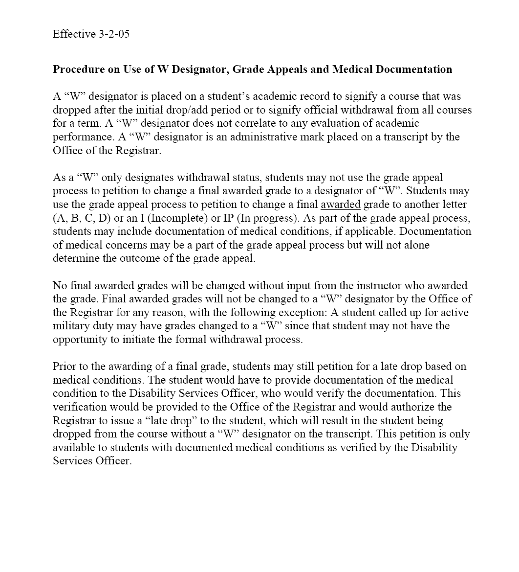 The University policy on withdrawn courses and "W" grades is detailed in the following two documents from the Office of Academic Affairs: