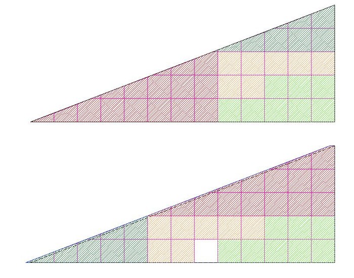 ok guys, let me try to explain this in geometric language. the slope of the red triangle=p/b= 3/8= 0.375 and the slope of the green triangle=p/b= 2/5= 0.4 which shows that the hypotenuse of the whole triangle is not a straight line (the slopes of individual hypotenuses being not equal) now, if you place the triangle with greater slope in the bottom and the one with smaller slope on the top, it happens to occupy more space beacause of its convexity.....notice the small squares in the corner are shaded more in the second triangle. the difference happens to be equal to 1 square unit.