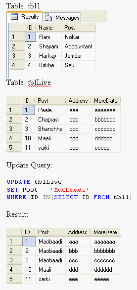 UPDATE LiveTable SET column = 'string value' where livetable.columname in (select tablename.columname from tablename(S) left outer join where conditions).