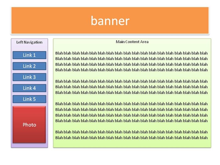 A banner area on the top across. A navigation bar on left side. And the main body area on the right. All I need is bunch of buttons on the left navigation bar so that when one clicks on it the content on the main body area would change.