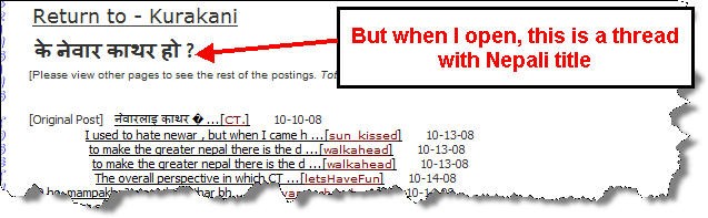 Guys, When I open Sajha.com, I see lots of thread names with Russian (or whatever) character encodings. But when I actually open the thread, it's a one with thread title in Nepali Characters. Sabalai yestai bha chha ki tin barsa agaadi maile piyeko जांड balla aayera lagna thalyo?