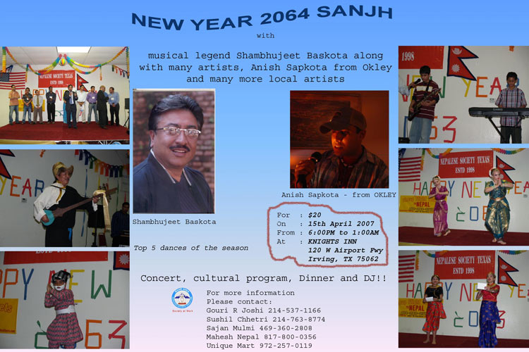 Dear Friends & Families, Nepalese New Year 2064 is around the corner. Nepalese Society Texas is going to host an event and celebrate this occasion with community members on 15th April 2007. I would like to request all of you to come and celebrate this event with Nepal's top musical legend "ShambhuJeet Banskota" and Anish Sapkota from Okley Band. We also would like to request for your help to make this program successful . Please spread the news and also distribute this attached flyer in your networks of friends. Below is the summary of the programs. Door Opens: 6 PM Program time 7 PM - 10 PM DJ Afterward. Entrance Fee: $20.00 Program Includes: Cultural Program, Dinner, Musical Night with Shambhujeet Banskota & Anis Sapkota from Okley Band and DJ Venue: Knights Inn 120 W Airport Fwy Irving, TX 75062 Please visit www.nepalesesociety.org for more details. As always, thank you and looking forward for your help. Happy New Year 2064!!
