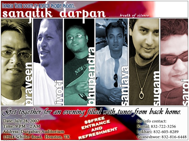 A COMPLETELY FREE musical show of two and half hour with sanjaya shrestha,sugam pokharel,saroj dutta,jyoti ghimire,bhupendra bajracharya and praveen manandhar.