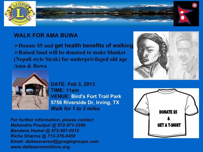 The goal of this program is to raise funds for our underprivileged Ama Buwa in Nepal who are suffering from cold winter by distributing them "sirakh" that would help them to survive. Dallas Everest Lions Club cares for our elderly parents who are not only suffering from crisis of old age but are also struggling to survive from the cold winter in Nepal. Walk for Ama Buwa has been organized by Dallas Everest Lions Club in Irving, Texas to be held on Feb 3, 2013, at 11:00 AM in Bird's Fort Trail Park (Please disregard Campion Trail, Irving, TX which was confirmed in earlier email). Walk will be for 1 to 3 miles. Your participation makes a difference to save the life.