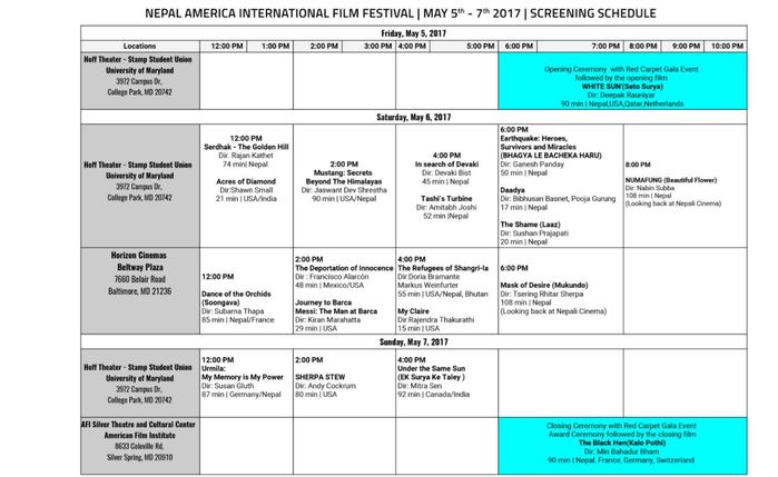 The festival takes place in Washington DC metro area (Maryland, Virginia and Washington DC) in collaboration with Nepali Diaspora community organizations, personalities and other cinematic organizations of the United States and Nepal.