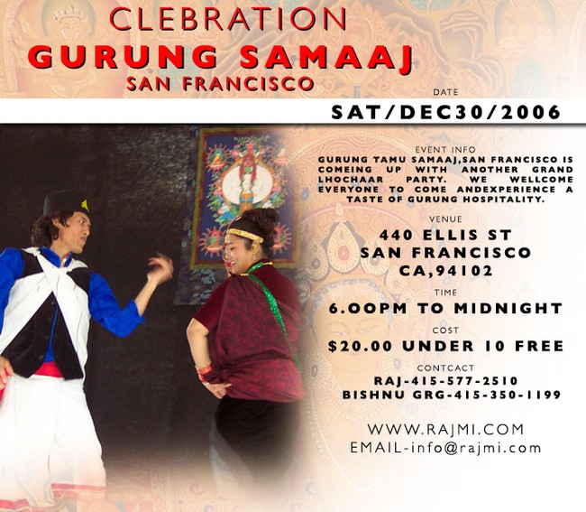 CLEBRATION-GURUNG SAMAAJ, SAN FRANCISCO DATE-SAT/DEC30/2006 EVENT INFO, GURUNG TAMU SAMAAJ,SAN FRANCISCO IS COMING UP WITH ANOTHER GRAND LHOCHAAR PARTY.WE WELLCOME EVERYONE TO COME AND EXPERIENCE A TASTE OF GURUNG HOSPITALITY. WHEN-SAT/DEC30/2006 VENUE-440ELLIS ST,SANFRANCISCO CA,94102 TIME-6.OOPM TO MIDNIGHT COST-$20.00 UNDER 10 FREE CONCACT-RAJ-415-577-2510 BISHNU GRG-415-350-1199 WWW/RAJMI.COM EMAIL-info@rajmi.com WHO COME WEARING ANY TRADITIONAL DRESSES THAT WILL BE WINNING PRIZE.