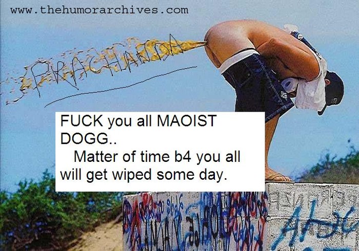 what a dumb ass, getting killed by your own comrades for supporting them. You all PHUKED-UP maoist supporters, keep supporting them and get killed... LMAO - sending my stinking gas from my ass towards your home. ps: (LMAO - Laughing My Ass Off).